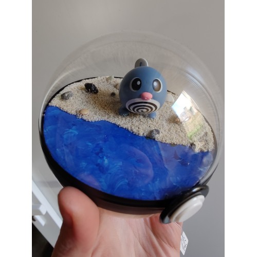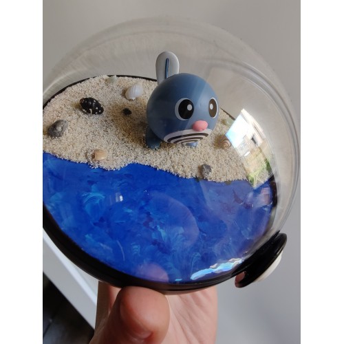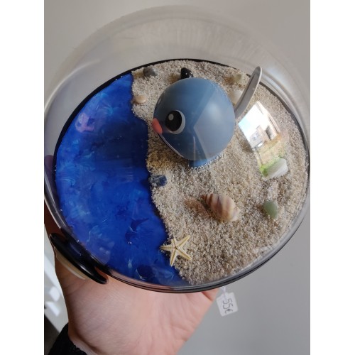 Décor plage, sol en sable, eau en résine, décor de pierres bleues, et coquillages.