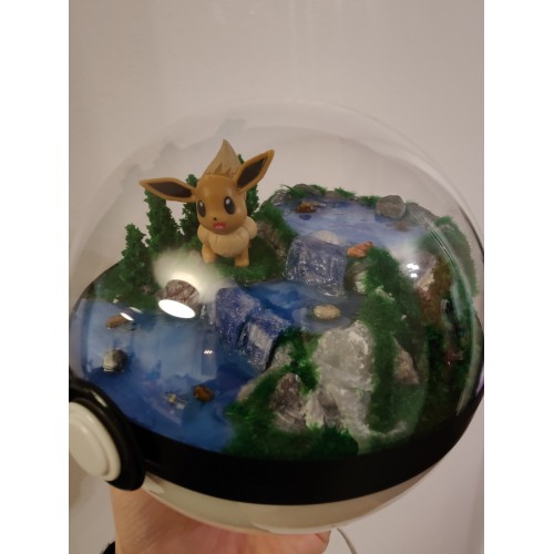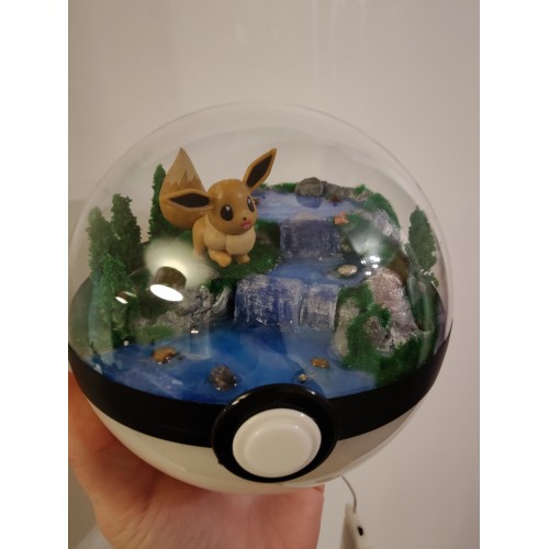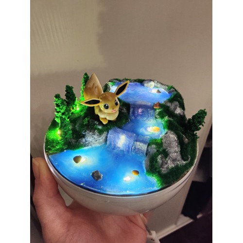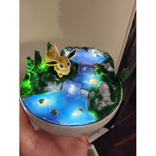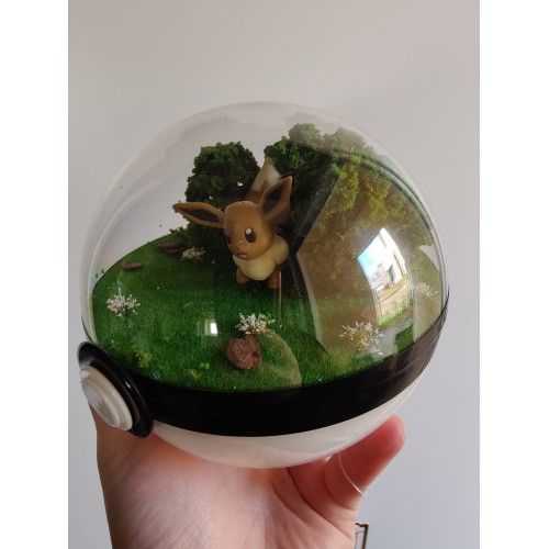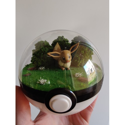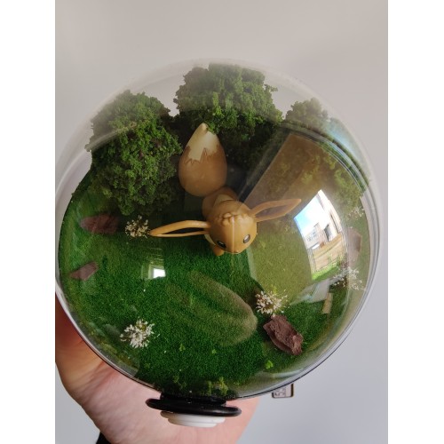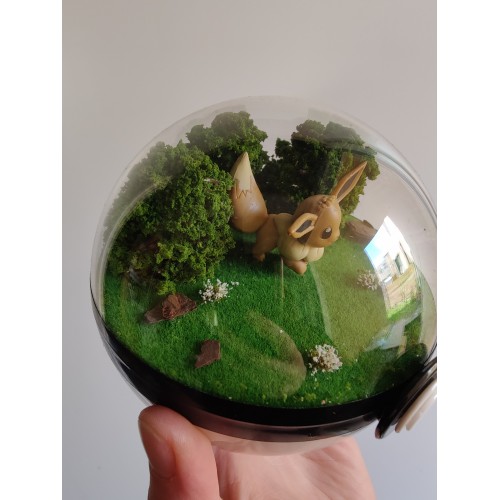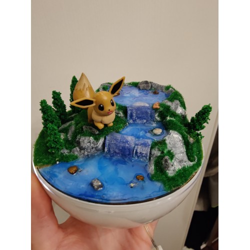 Diorama fait main accueillant une figurine pokemon de Evoli.