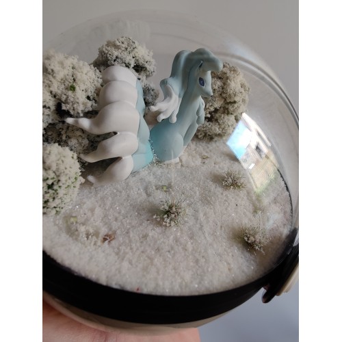 Décor rocailleux, sol en sable blanc, arbres floqués en blanc, fleurs blanches.