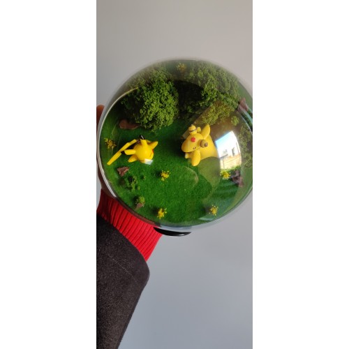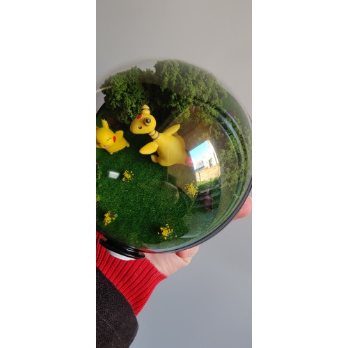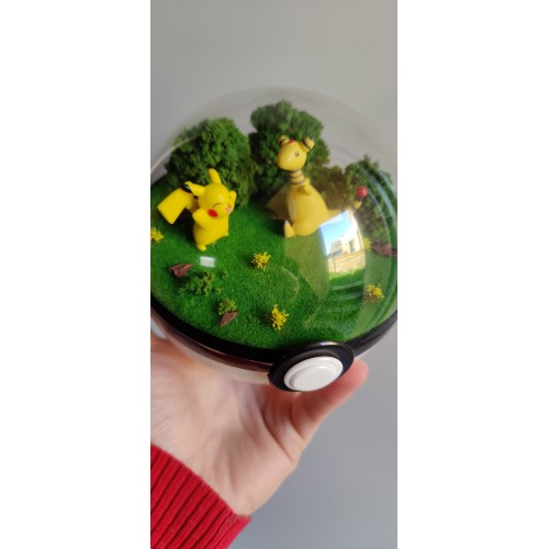 Diorama fait main accueillant deux figurines pokemon. Une de Pikachu et une de Pharamp.
