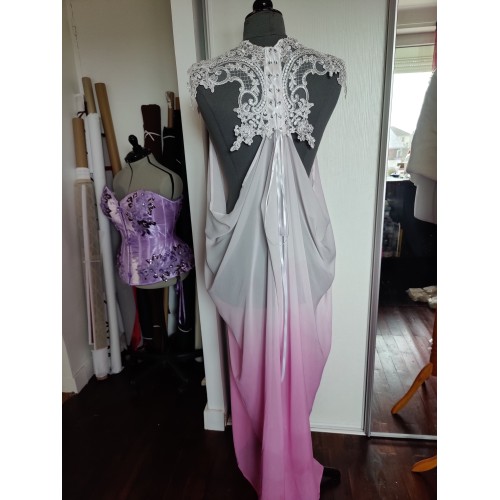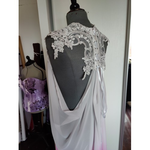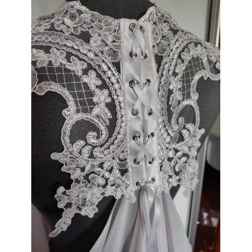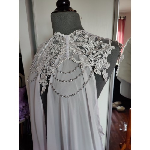 Col en dentelle large cousue, rubans de satin blanc, laçage blanc au dos pour pouvoir le mettre et l'enlever facilement.